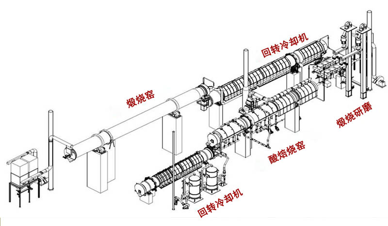锂云母、锂辉石等原料与其它物料料混合后的原料从回转窑窑尾筒体高温进入筒体内进行焙烧。物料在陪烧窑内,受窑体斜度和自转的影响,产生径向和横向的移动,物料被带到高处,与高温烟气进行热交换,进而产生热工反应,进而达到焙烧的目的。窑转速受变频电机调节,可根据反应物料反应时间的要求进行调节窑内停留时间,燃烧器配备天然气流量和风量监控和调节功能,满足烟气温度和流量流速的调节功能,进而适应原料的焙烧区间温度。